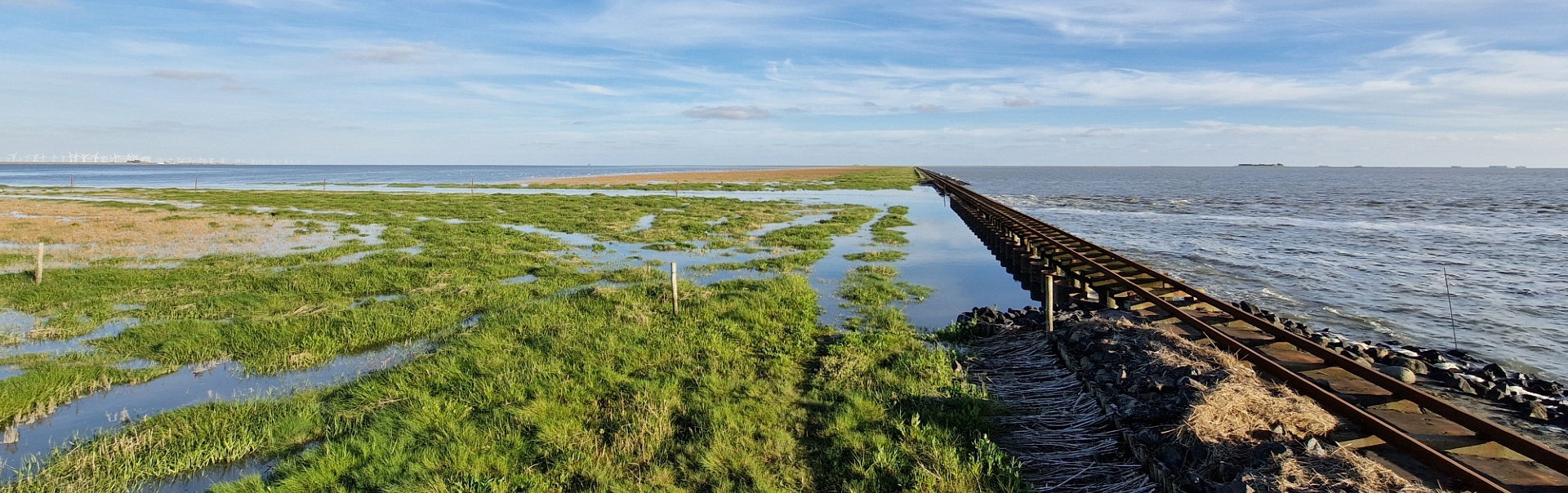 The raised hide is located halfway along the dam near the fox barrier. The built-in barrier is intended to prevent predators from reaching the Halligen.